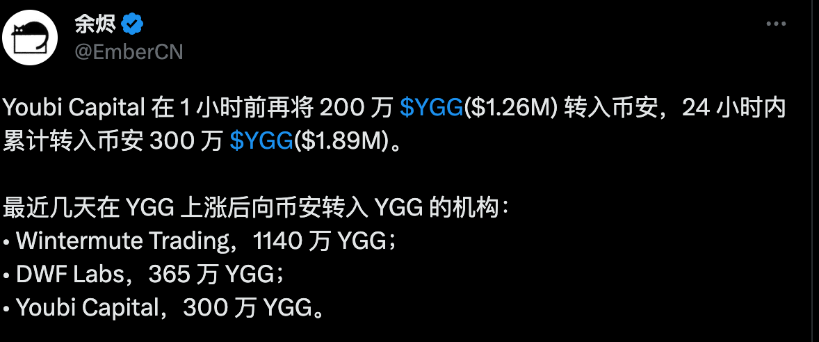 日前链上分析师余烬就统整出,近几天在$YGG 上涨后向币安转入YGG 的机构: