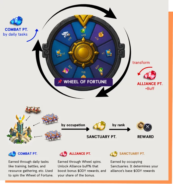 • 联盟点数(AP):玩家每次使用 CP 旋转命运之轮时获得。这些点数会影响联盟的最终奖励增益。