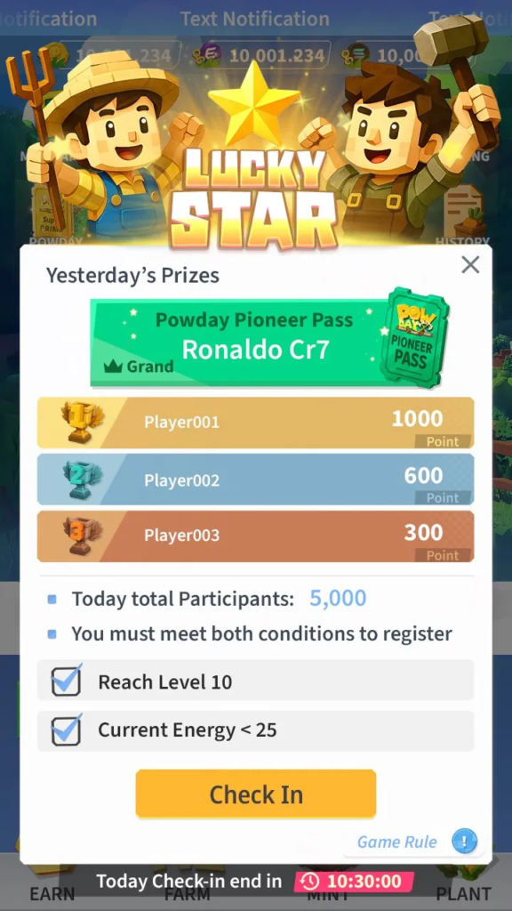 Powday 还强调了与排名系统并行运作的第二条奖励渠道。其“幸运星”功能每天会随机抽取4名幸运玩家,为那些可能并不以排行榜前列为目标,但仍希望每天获得奖励的玩家提供了一条额外的途径。
