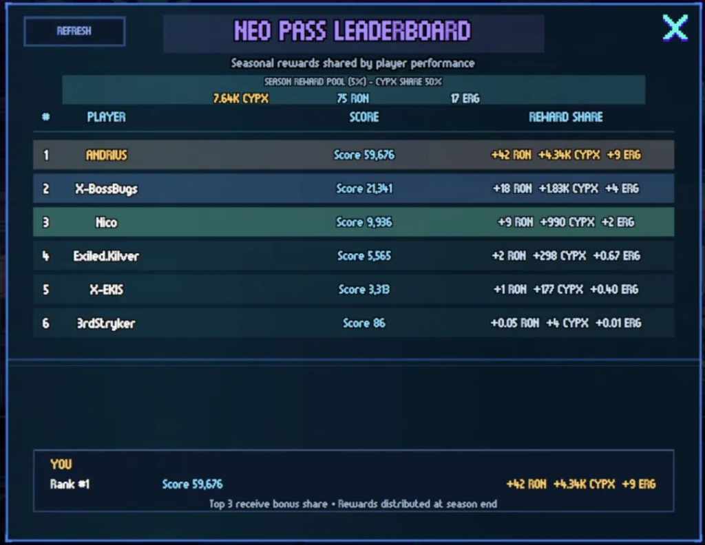 Neo-Pass 采用简单的经验值系统。玩家通过游戏内活动获得经验值,提升角色等级,最终获得50个赛季奖励等级。每个等级都会解锁包括游戏资源、NFT、金币和赛季战利品在内的物品。选择高级路线的玩家还可以解锁额外的排行榜,排行榜前列将获得以 $CYPX、$RON 和 $ERG 形式发放的额外奖励。